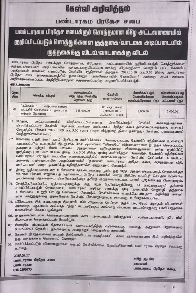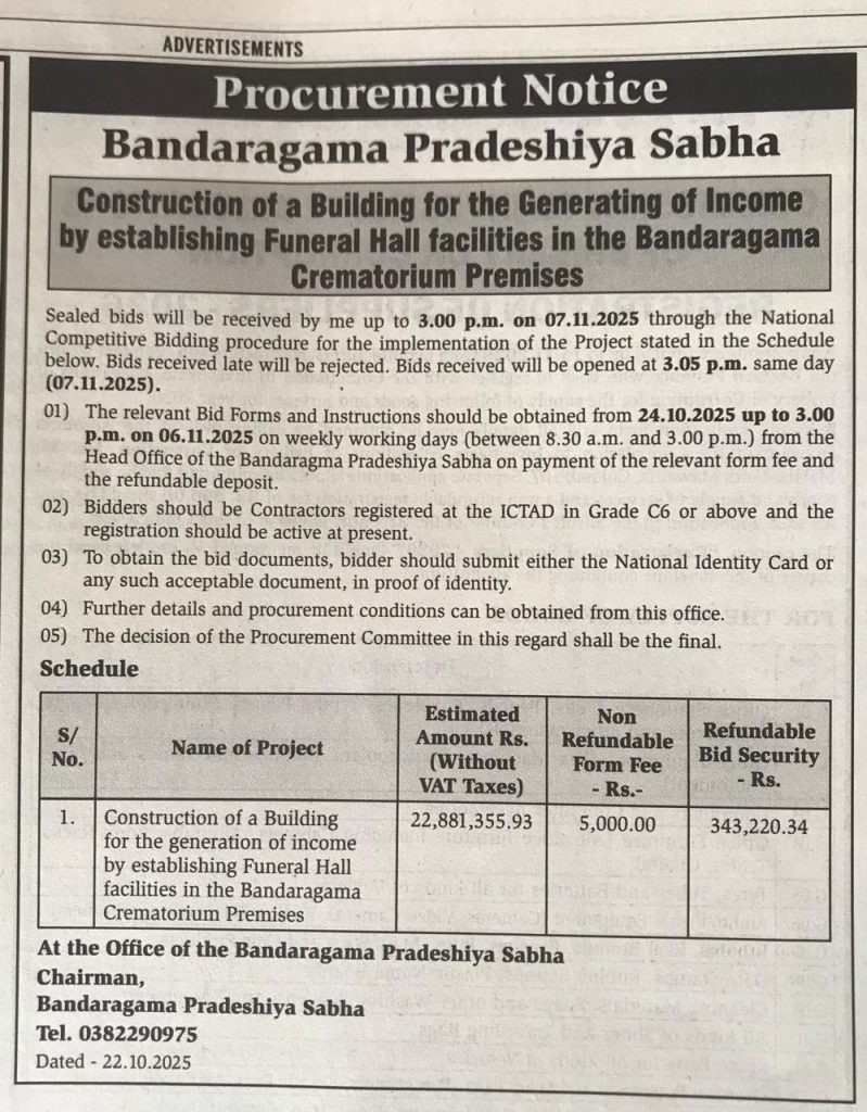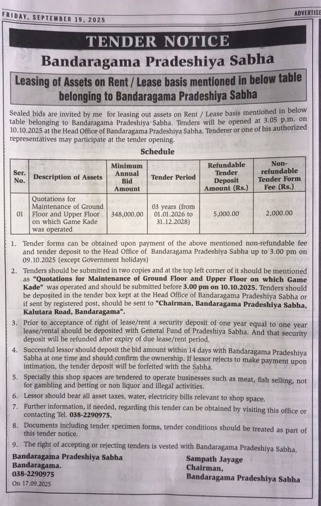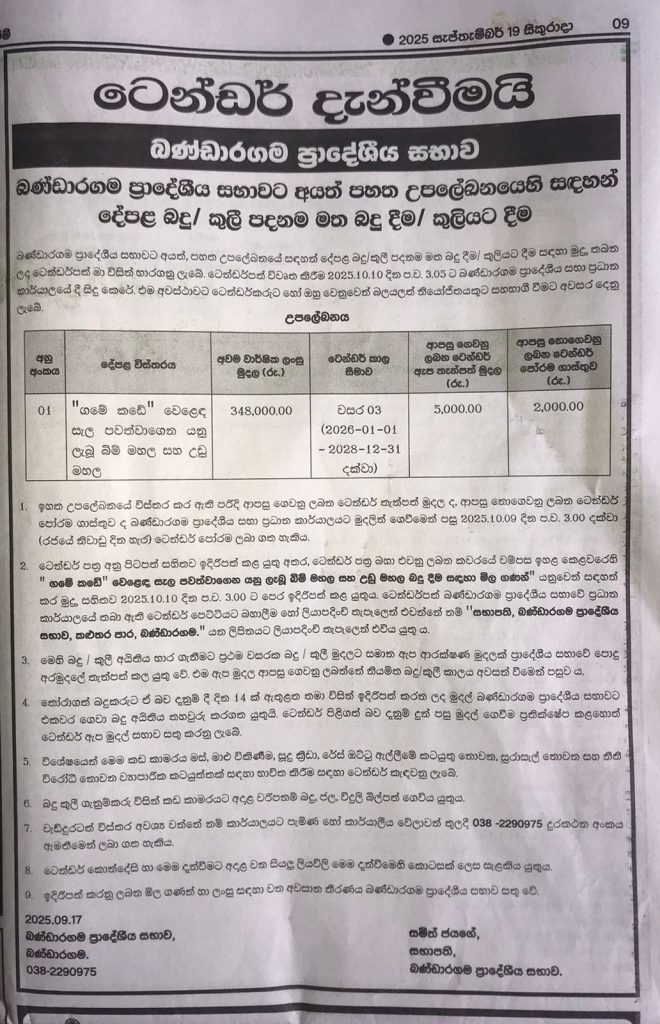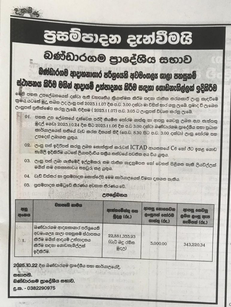 • බණ්ඩාරගම ප්‍රාදේශීය සභාවට අයත් මෛත්‍රී නගර ශාලාව අළුත්වැඩියා කිරීම සදහා මිල ගණන් කැඳවීමේ ප්‍රසම්පාදන දැන්වීම දිනමිණ, තිනකරන් සහ ඩේලි නිවුස් පුවත්පත්හි 2023/04/21 දින භාෂා තුනෙන්ම පළ විය.